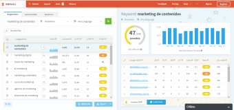 Otro excelente buscador de palabras clave es el Keyword Finder, que además muestra las palabras relacionadas a la que estamos buscando, y también qué páginas están posicionadas para esas palabras. Incluye además el volumen de búsqueda por mes; algo que también podemos revisar en Google Keyword Planner, pero en la versión paga. Sin pagar nada en esta herramienta, podremos descargar incluso los volúmenes de búsqueda y sabremos cómo está posicionada la competencia, lo cual nos ayudará a determinar qué páginas es necesario analizar para trabajar en un mejor posicionamiento por nuestra parte.